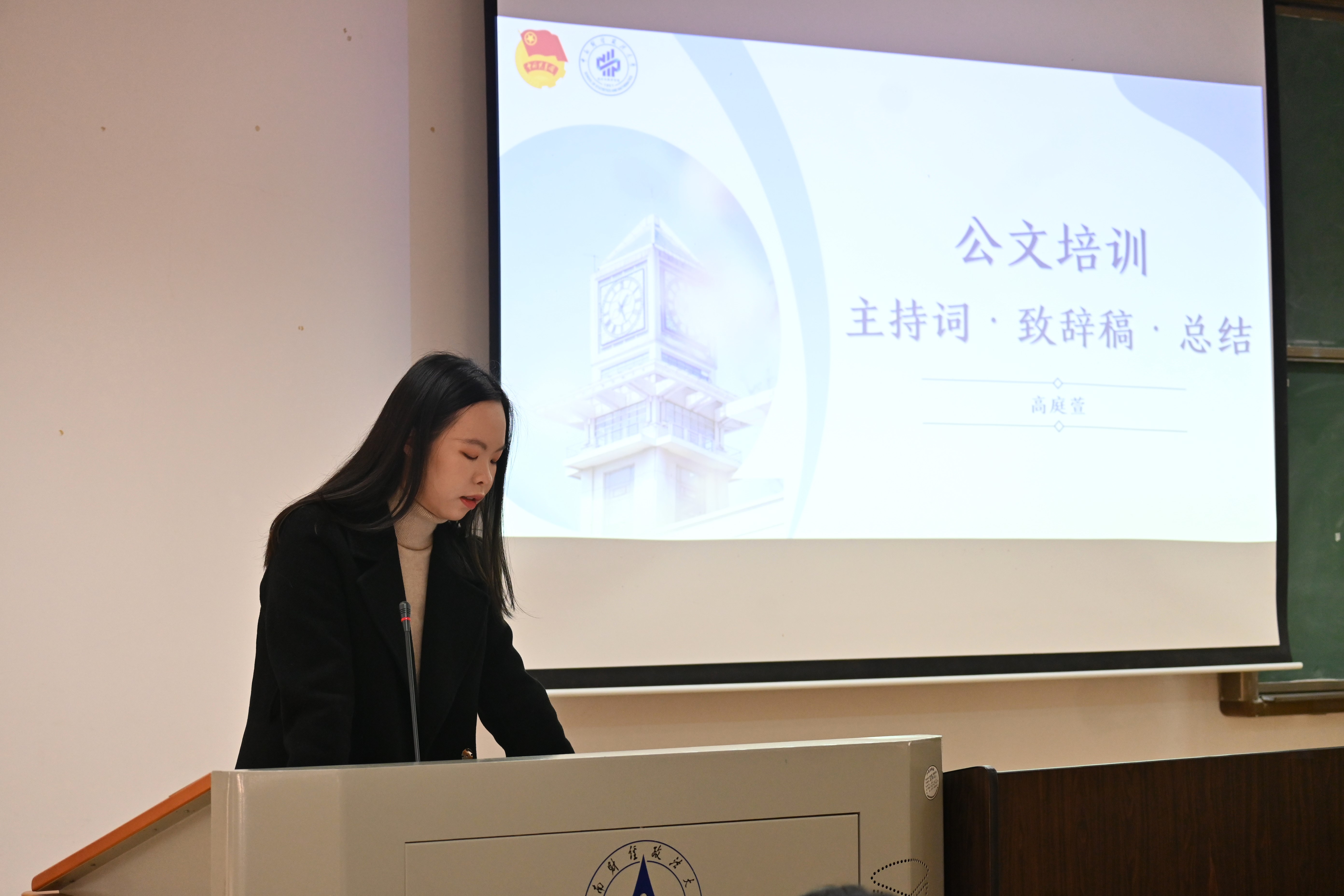 最后,院团委学生副书记高庭萱就文稿的主持词、嘉宾致辞和总结材料撰写要点进行授课。她根据现实场景分析,介绍了各种场景下不同文稿的写作要求与核心要素,并采用提问互动的方式,让成员们对文稿的写作有了更加深刻的认知,能将之更好地运用到以后的工作实践中。