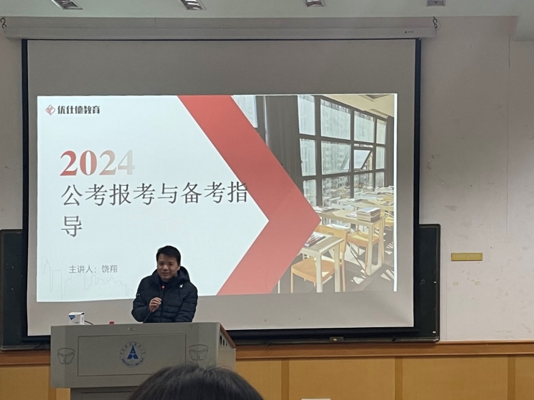接下来,优仕德教育的饶翔老师为同学们带来了关于考公形势的分析和指导。饶老师在考公方面具有丰富的实战经验和独特的见解,对于考公的岗位选择、备考策略等都有着深刻的认识。他通过实际案例和解析,为同学们揭示了考公的重要性并提出了应对策略,使同学们对考公有更清晰的认识。