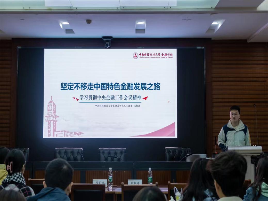 第26届研究生支教团成员张栩源、冯艾丽进行主题宣讲。张栩源以“坚定不移走中国特色金融发展之路”为题,向学员传达了中央金融工作会议精神。他不仅向大家介绍了中国特色金融的发展现状,还从“党中央对金融工作集中统一领导”“金融服务高质量发展”“金融改革与高水平开放”“金融监管与风险化解”四个方面总结出会议的重要内容供学员着重学习。最后,张栩源鼓励大家躬身实践,夯实专业基础,坚持金融报国,将个人发展融入到国家战略中去。