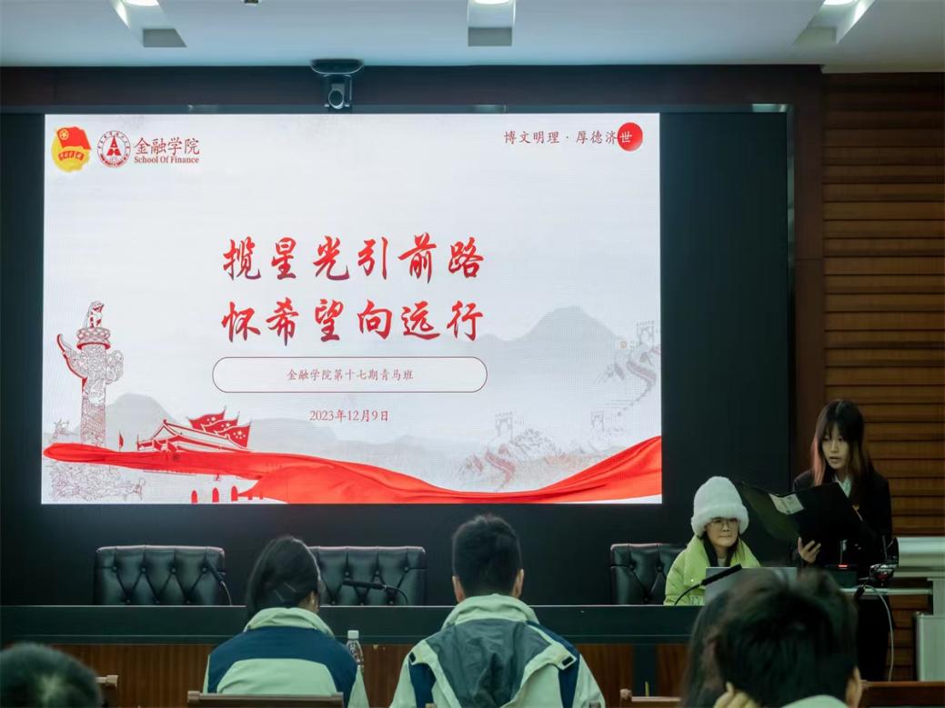 新闻网讯(学生通讯员 杨然洁)为加强青年马克思主义思想教育,引导金融学子树立共产主义远大理想,坚定建设中国特色社会主义伟大国家的必胜信念,金融学院第十七期青马班于12月9日上午八点半在文泉南313开展主题为“揽星光引前路,怀希望向远行”的教育活动,金融学院第十七期青马班学员均参与此次活动。
