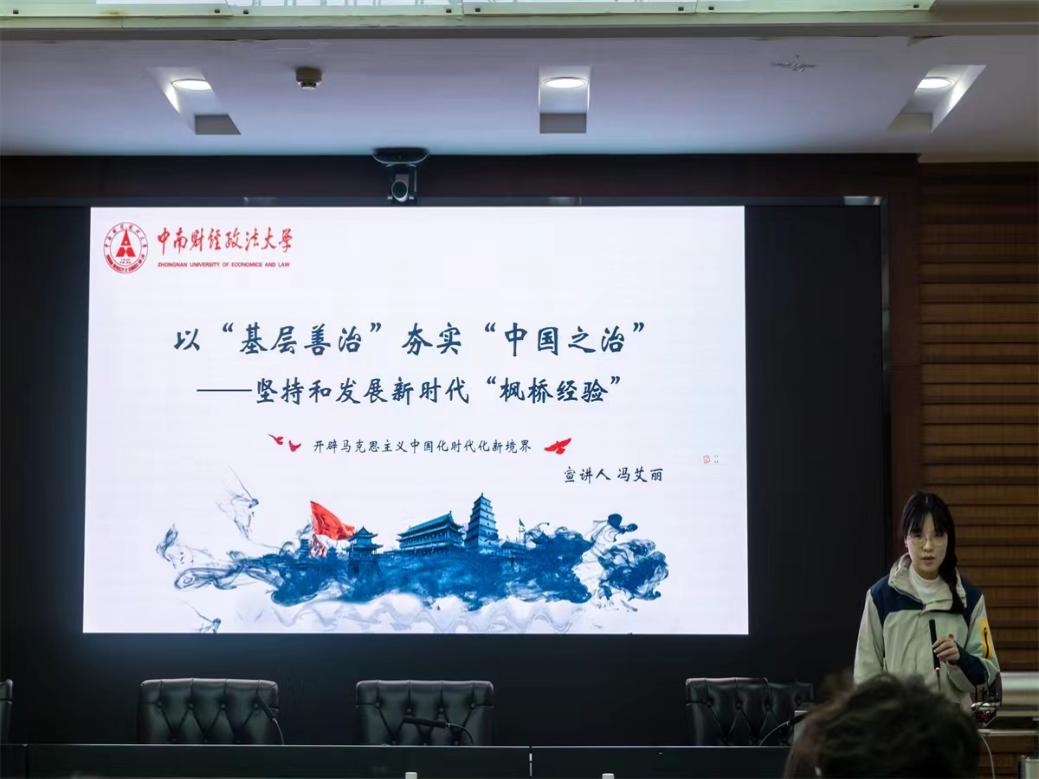 冯爱丽则以“‘基层善治’夯实‘中国之治’——坚持和发展新时代‘枫桥经验’”为题,向大家介绍了“枫桥经验”这一开辟了马克思主义中国化时代化新境界的典型范例。她表示,基层是国家治理的基石,要借鉴并不断发展“枫桥经验”,使基层治理满足时代发展需求,真正做到从历史走向未来。她还勉励大家作为生力军,要扎根于基层社会治理的实践沃土,为推进基层社会治理贡献智慧和力量。