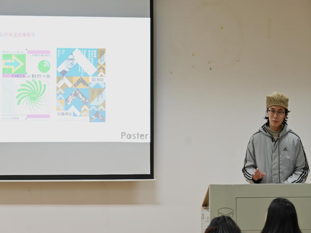 随后,许焕枫根据所学和实践经验为同学们分享海报的制作方法。他介绍了海报的作用和意义,从海报的四个要素、练习技巧、案例分析等方面进行了详细的讲解。他强调,海报要根据实际需求来制作,制作者要灵活运用商业、社会、艺术等风格来满足需求。