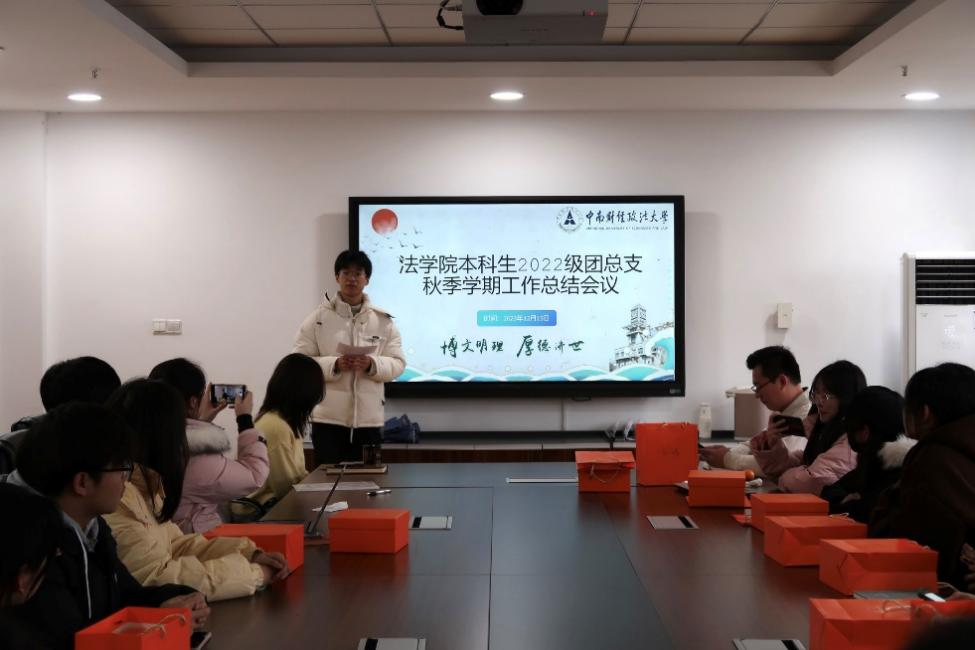 新闻网讯(学生通讯员 赵胤然 刘媛媛)12月15日中午,法学院本科生2022级团总支于文治楼615会议室召开了工作总结会议。2022级辅导员王浩老师、牛静老师出席,年级团总支实践部部长苏鸿志同学主持会议。
