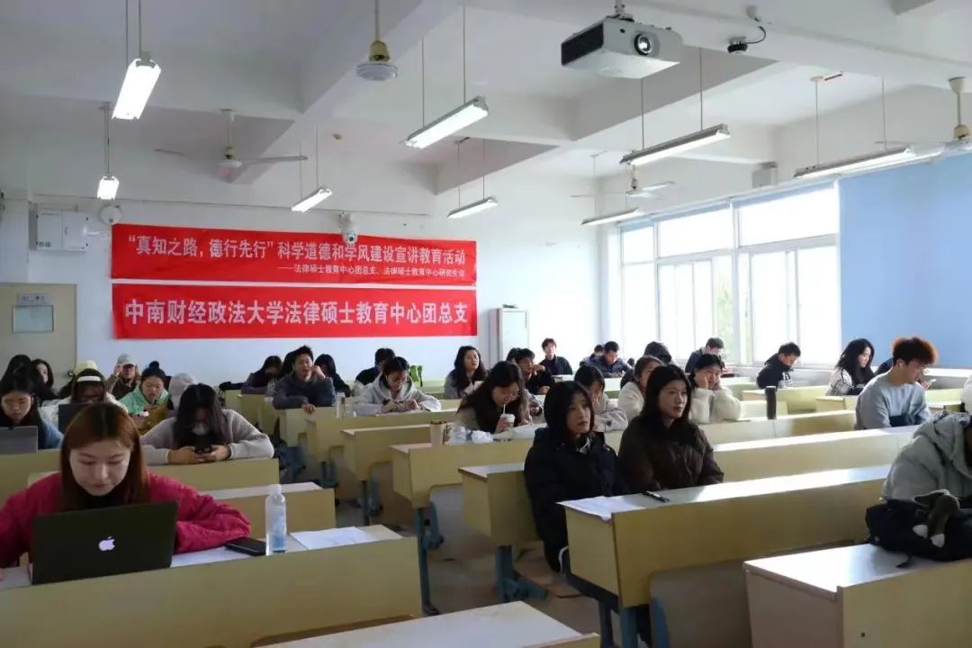 新闻网讯(学生通讯员 李双娇 王济安 王嘉宁)为深入学习贯彻习近平新时代中国特色社会主义思想和党的二十大精神,进一步深刻领会习近平总书记关于科学道德和学风建设的重要指示精神,中南财经政法大学法律硕士教育中心于12月8日上午在文添楼202教室举办了“科学道德和学风建设宣讲教育”活动。本次活动旨在引导广大学生自觉遵守科学伦理,培养正确的学术态度和行为规范,促进全体师生共同营造诚信、创新、求真的良好学术环境。