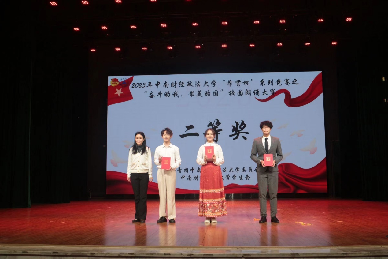 新闻网讯(学生通讯员 朱彬彬 黄芷妍)博文明理,齐咏中南,厚德济世,共赞中华。为弘扬爱国主义精神,发扬勤勉美德,2023年12月10日下午2点,2023年“希贤杯”系列竞赛之“奋斗的我,最美的国”校园朗诵大赛决赛在南湖校区艺体中心音乐厅举行。史淋尹、来安然、邵子谦、晏家宁四位同学以节目《河床》代表我院参与“希贤杯”校园朗诵大赛。