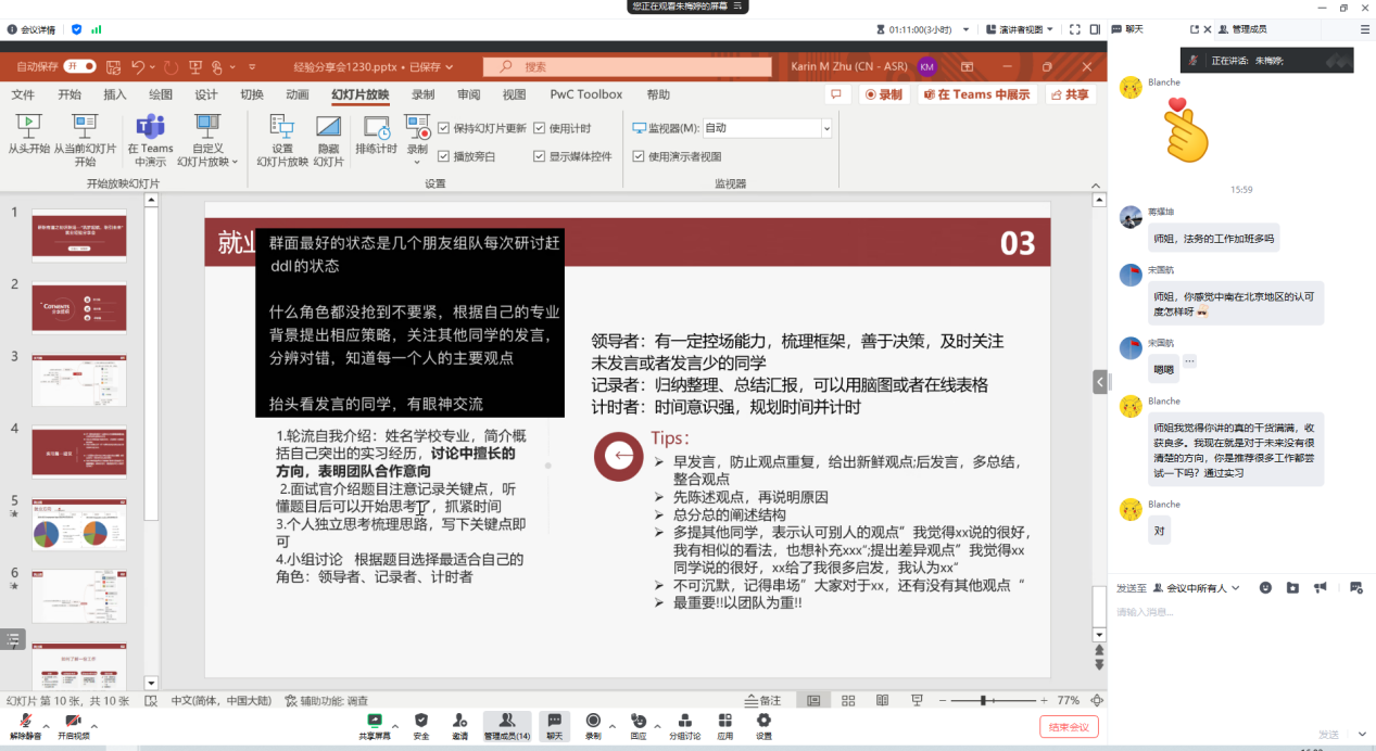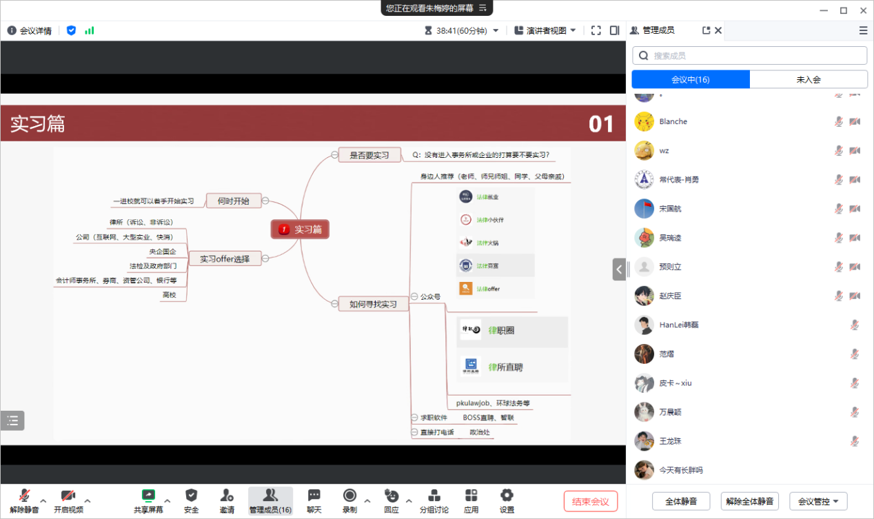 活动邀请到2020级毕业生朱梅婷(现就职于普华永道风险控制部)进行分享,为与会的同学们介绍了实习经历、行业现状、求职技能等内容,贾英豪同学担任本次活动的主持人,来自法律硕士教育中心的数十位同学积极参与了本次分享会。