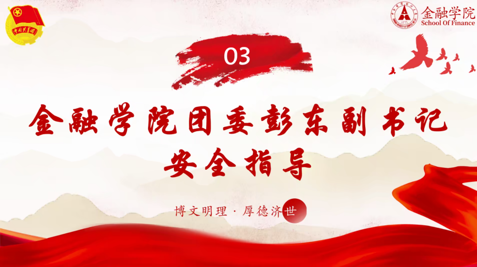 金融学院团委副书记彭东作安全指导。彭老师为大家进行了关于出行常识、活动安全、卫生防护、突发情况处理、财产安全等方面的指导,并强调个人安全是社会实践的重中之重,提醒大家在保护好自身安全的前提下去进行社会实践。