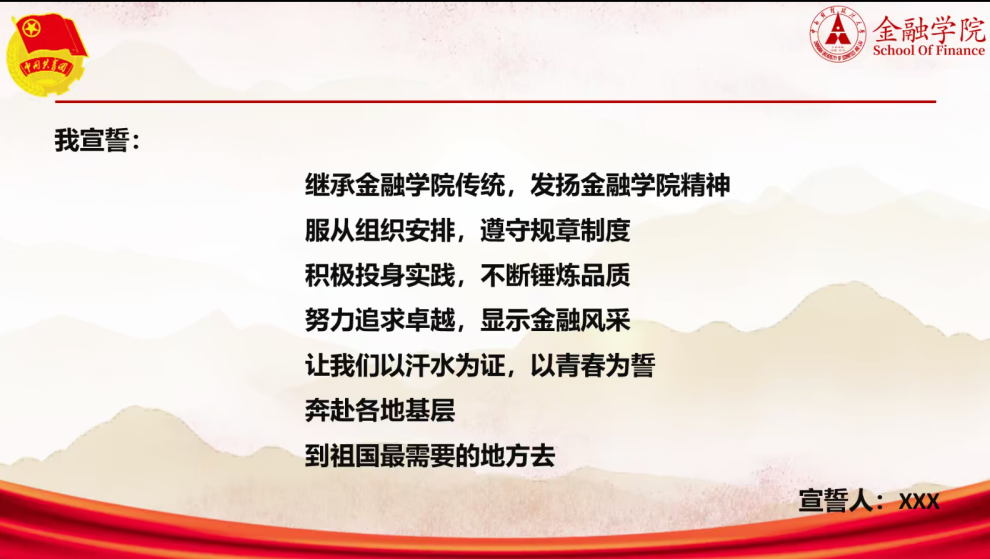 金融学院“融梦”实践团寒假社会实践代表宣誓。学生代表闫卓和霖带领团员进行宣誓,不仅体现了大家希望在学思渐悟中坚定理想信念,在祖国大地上书写青春篇章,也进一步提高了同学们走进基层、亲身实践的热情与自豪感。