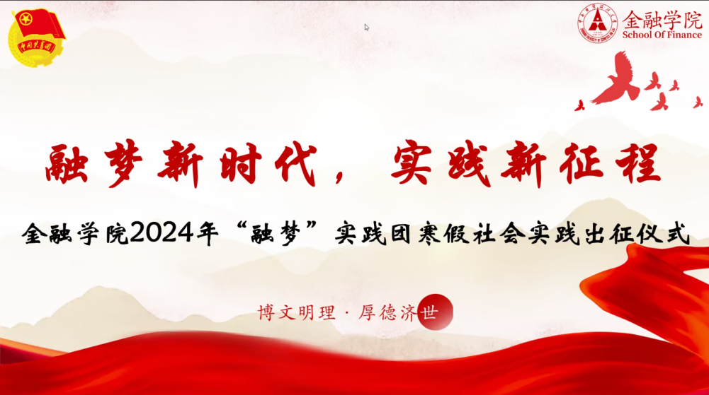 新闻网讯(学生通讯员 韩飞虎 杨然洁)为响应习近平总书记号召,鼓励青年积极投身于社会实践,2024年1月23日下午14:30,金融学院“融梦”实践团寒假社会实践出征仪式在腾讯会议成功举办。金融学院对本次寒假社会实践的开展进行部署并强调注意事项,为社会实践活动的有序进行打造了良好基础。金融学院团委副书记彭东出席本次会议。
