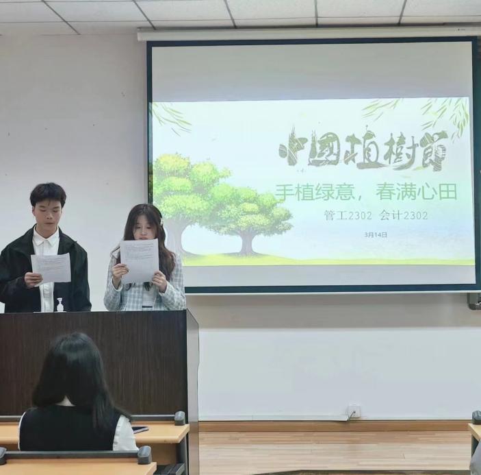 在“不负春光,‘植’得期待”的主题实践活动中,管工2302团支部的支委卜佑琳为支部成员们详细介绍了植树节的历史渊源、深刻内涵和社会意义,同时解读了植树节节徽的象征意义。她通过生动有趣、深入浅出的动画展示和文字解说,让支部成员们深刻感受到国家绿化大地、保护生态环境的坚定决心。