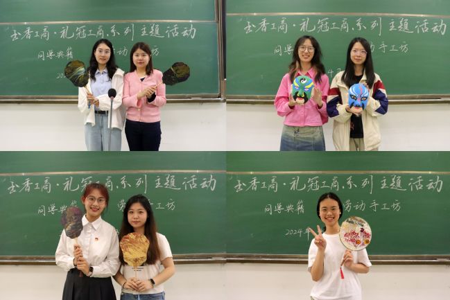 此外,本次活动还设置了手工制作传统工艺品环节。同学们参与到脸谱、干花团扇、艺术门牌、环保袋DIY和漆扇制作中,在体验传统工艺的同时,感受劳动精神与传统文化之美。