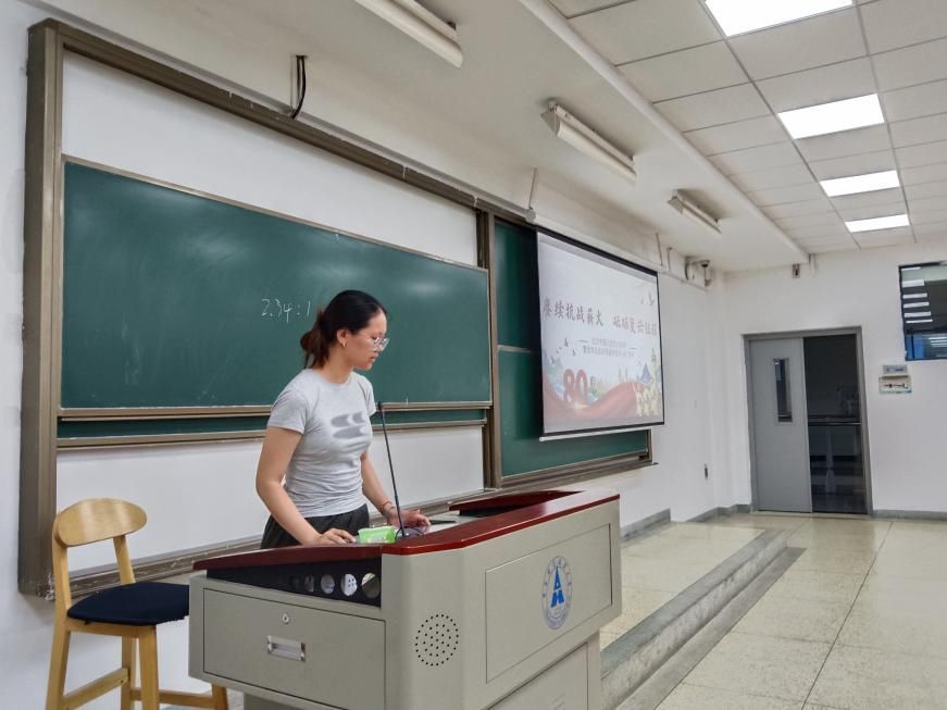 团日活动的第一部分由团支书王欣悦主持。她带领大家回顾了抗日战争那段烽火连天的峥嵘岁月,讲述了英雄先辈们可歌可泣的感人事迹。随后,她播放了九三阅兵视频片段,官兵们的铿锵步伐与高规格现代化装备的磅礴气势交相辉映,让在场每一位同学都直观地感受到了国家实力的强大与和平的来之不易。王欣悦同学号召全体团员弘扬抗战精神,以压倒一切困难而不为困难所压倒的决心和勇气,敢于斗争、善于创造,锲而不舍为实现中华民族伟大复兴而奋斗。