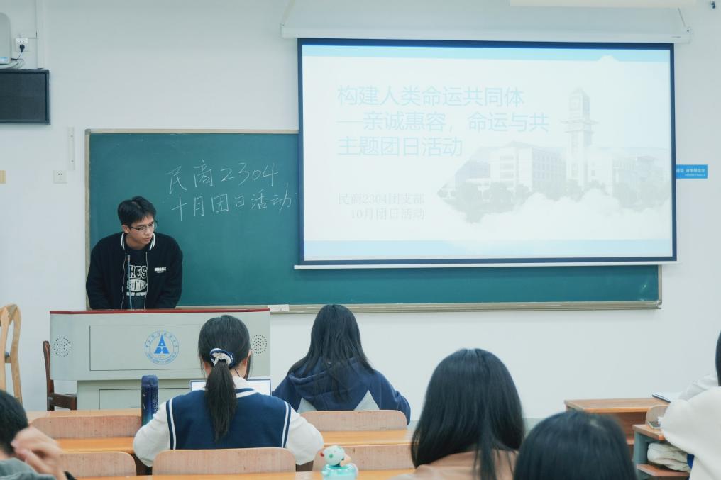 本月,民商2304班团支部还接续开展“构建人类命运共同体——亲诚惠容,命运与共”的主题团日活动,引导青年学子将个人命运置于世界大势中思考。活动中,副团支书汤籽同学以“时代之问”开篇,结合全球化背景下的全球性挑战深入浅出地阐释了构建人类命运共同体理念的时代背景与重大现实意义。从“亲诚惠容”的周边外交理念,到“持久和平、普遍安全、共同繁荣、开放包容、清洁美丽”的世界美好目标,团员们逐步理解这一理念并非抽象概念,而是中国为解决全球问题贡献的智慧方案。
