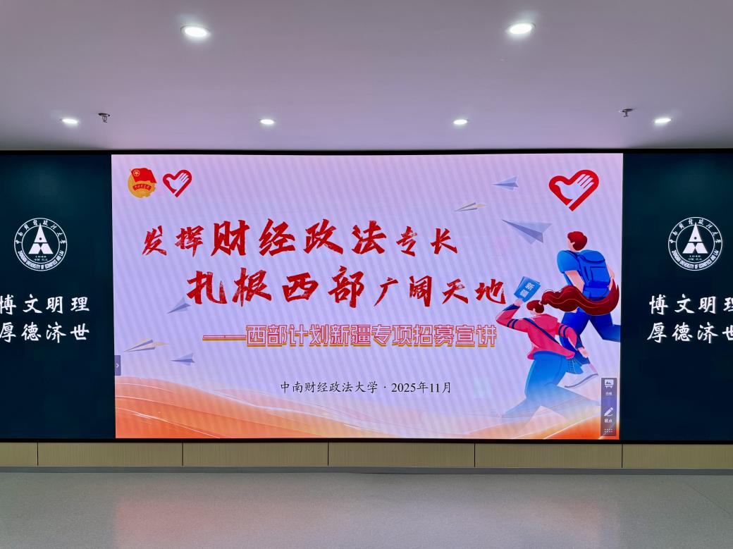 新闻网讯(学生通讯员 金飞扬 范祖瑞)11月27日下午,“报效祖国 建功西部”西部计划新疆专项招募宣讲会于中南财经政法大学南湖校区文瀚楼北区107实验室顺利开展。共青团新疆维吾尔自治区委员会大学生志愿服务西部计划办公室选派宣讲人员来校宣讲。