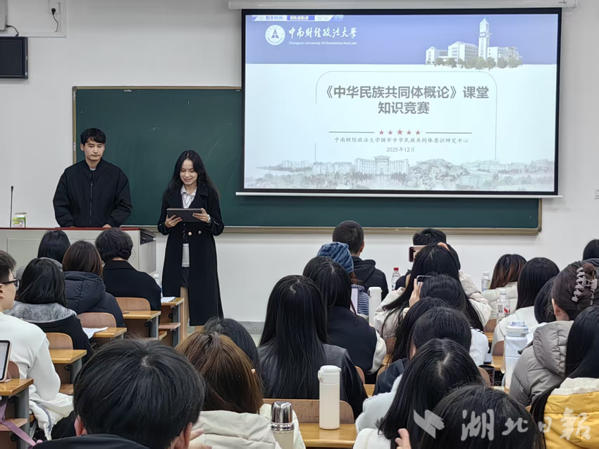 湖北日报客户端讯(通讯员 于苏甫江·玉山、 李绍腾)“这堂课,是我上大学以来觉得十分有意思和有意义的课!”中南财经政法大学《中华民族共同体概论》课程结束后,一名学生由衷感慨。近日,该校以一场“铸魂育心 知行合一”主题课堂知识竞赛作为结业的重要一环,推动理论教学与实践体悟相融合。