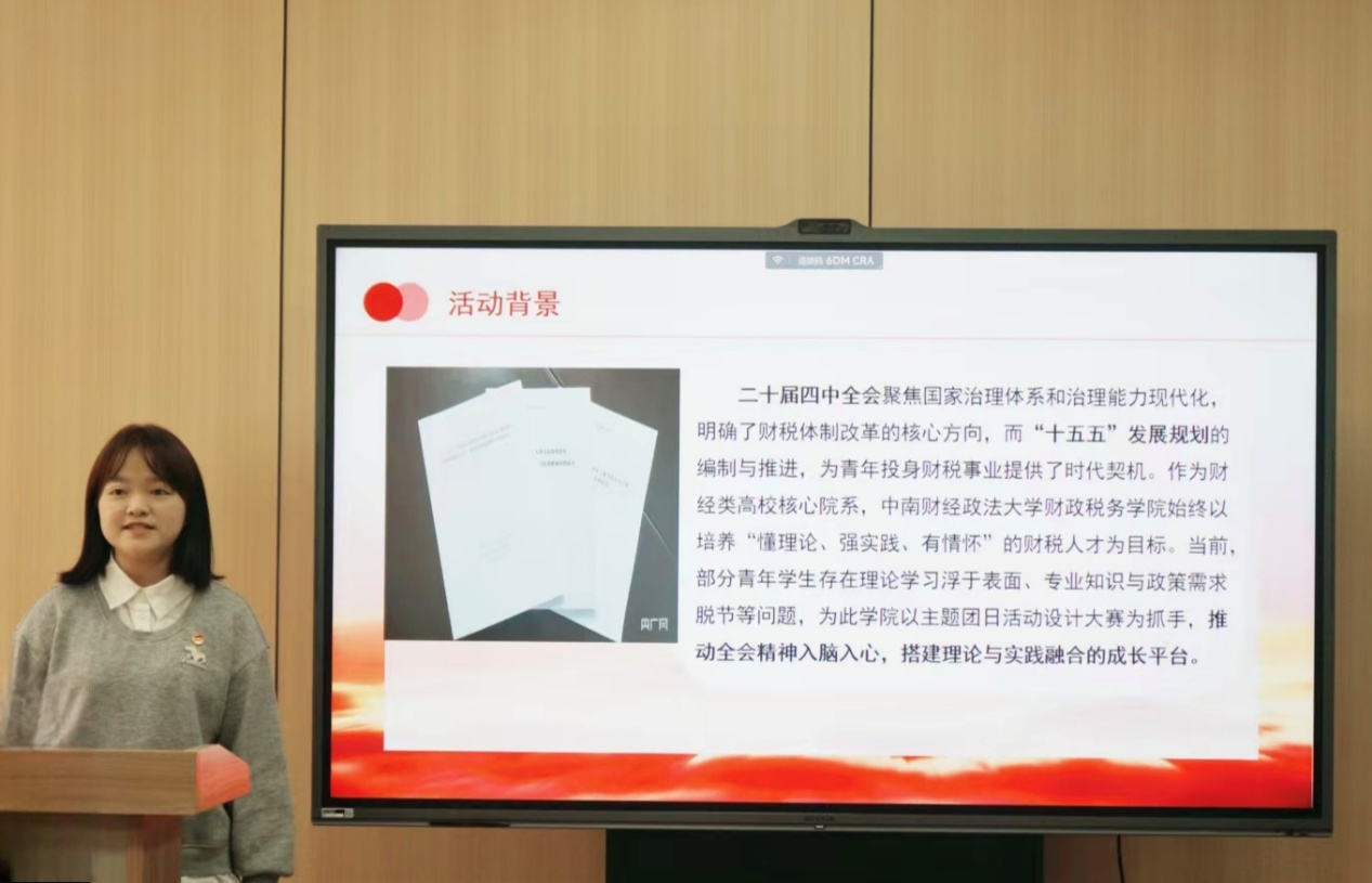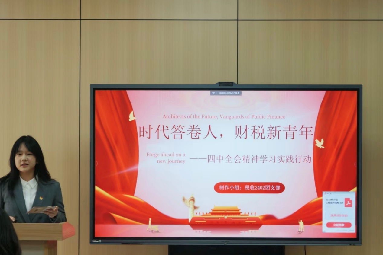 税收2402团支部以“时代答卷人,财税新青年——党的二十届四中全会精神学习实践行动”为主题,巧妙采用情景剧演绎这一创意形式,深入探索政策落地实效,充分体现了理论与实践的紧密闭环。