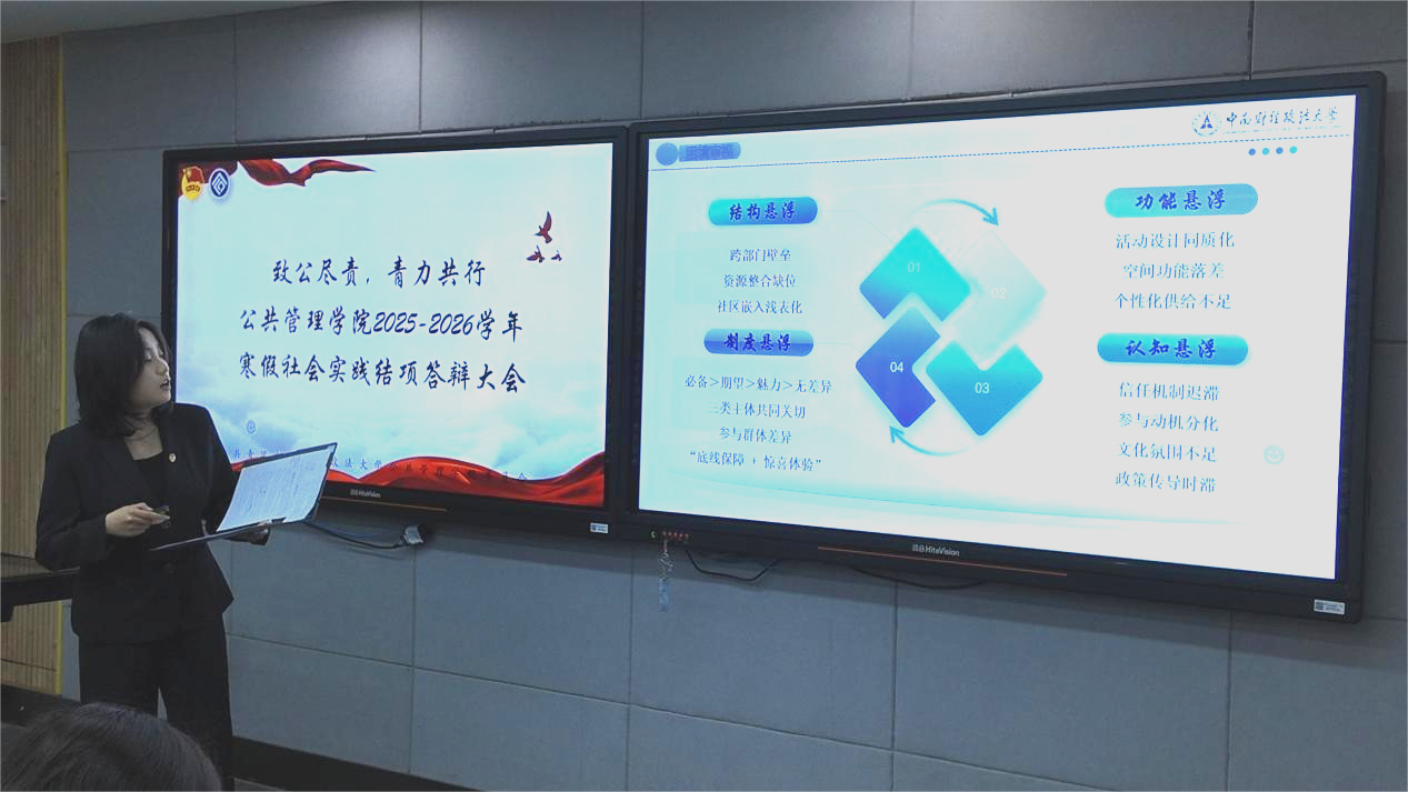至此,本次寒假社会实践答辩大会圆满结束。回顾整个实践历程,同学们不仅在专业能力上得到了切实的提升,更在社会观察中直面公共治理的现实课题,在知行合一中深化了对复杂治理问题的理解与思考。整场答辩会主题鲜明、内容翔实,充分展现了同学们在社会实践中锤炼本领、砥砺品格的成长轨迹,也生动体现了青年学子服务社会、投身治理的责任担当。此次答辩大会的顺利召开,既为过去一段时间的实践画上了圆满句号,也为新一年的社会实践工作积蓄了力量、注入了动能。大会在热烈的氛围中落下帷幕,而属于青年学子的实践探索,正向着更广阔的天地稳步延伸。