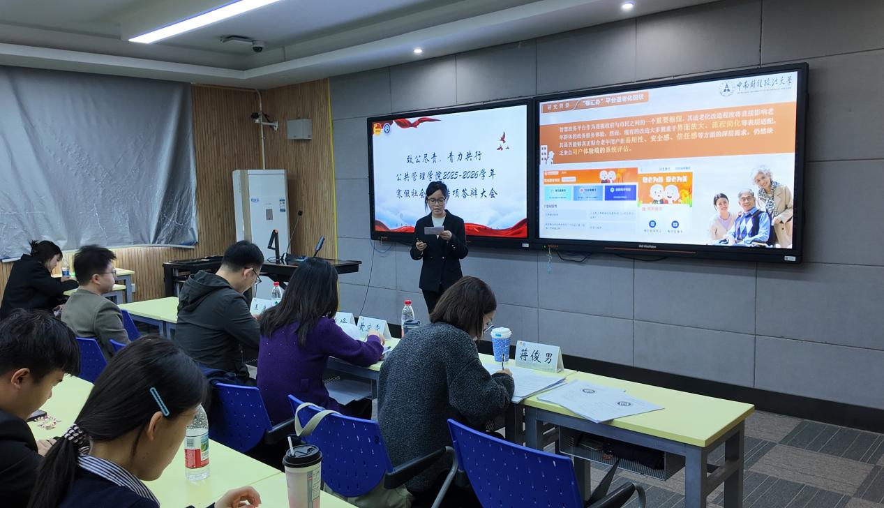 新闻网讯(学生通讯员 康瑞洋 吴振丞)为培养同学们的社会观察能力,提高同学们的专业素养,发扬公管学子上进知止,守正创新的精神,公共管理学院于3月26日在南湖校区文澴楼609成功举办“致公尽责,青力共行”寒假社会实践答辩大会。出席本次答辩大赛的评委及嘉宾有:行政管理系黄容霞老师、城市经济管理系张俊峰老师、劳动与社会保障系蒋俊男老师及院团委书记王康老师。共有9支队伍成功立项并参与答辩。