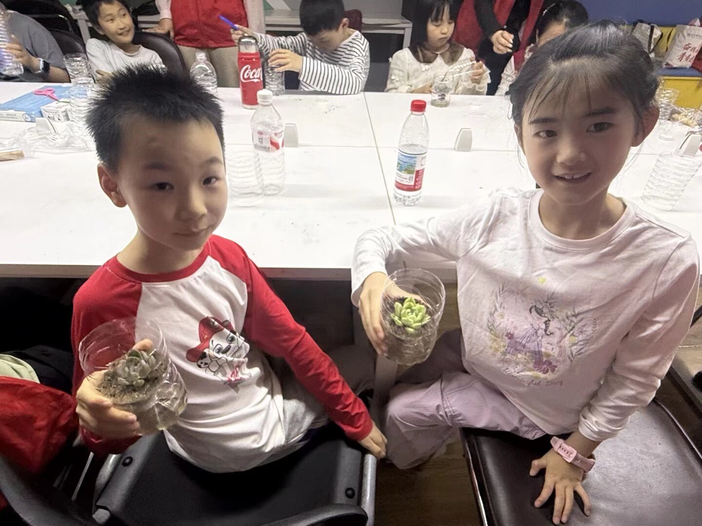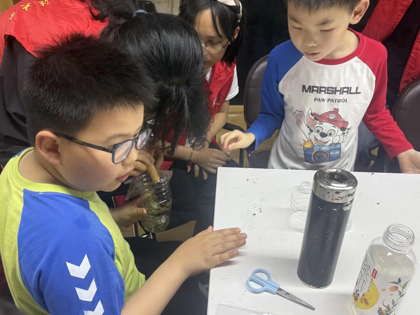 动员结束后,在工作人员的带领下,志愿者们分组陪伴小朋友开展课堂活动。活动伊始,志愿者们以生动易懂的语言,向孩子们科普绿色生态、资源循环以及植物生长的相关知识,讲解废旧物品回收再利用的环保意义。“平时喝完的瓶子、废旧纸盒丢掉很可惜,改造之后就能变成小花盆,养育小小的绿植。”志愿者耐心地向小朋友们讲解废物变宝的巧思。孩子们听得兴致勃勃,紧随志愿者的步骤动手实践:大家利用废旧容器进行创意改造,细心填土、栽种幼苗、铺设装饰铺面,一步步打造属于自己的迷你绿植微景观。在动手创作的过程中,志愿者全程在旁指导,手把手帮助小朋友调整植株、布置景观,引导大家感受生命成长与循环利用的乐趣。