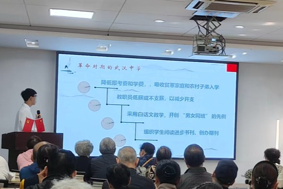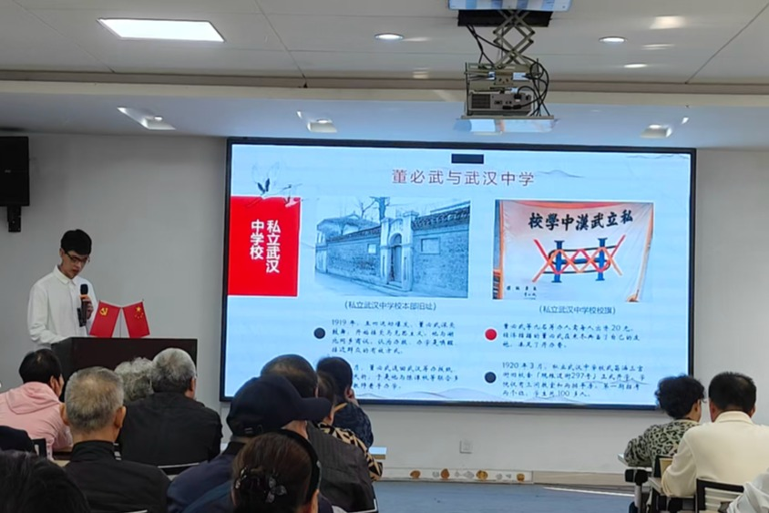 新闻网讯(学生通讯员郭莱美)为了深入学习红色校史,传承红色革命精神,10月17日,哲学院组织志愿者赴武昌区粮道街街道花园山社区开展“花园讲堂”第六期活动,志愿者吴子敬开展了一场以“传承红色基因,筑梦教育强国——从董必武创办武汉中学谈起”为主题的专题党课。主讲人吴子敬从董必武与其创办武汉中学,革命中的武汉中学和现代的武汉中学三个维度引出教育强国梦建设,全方位解读了董必武与武汉中学的红色故事。