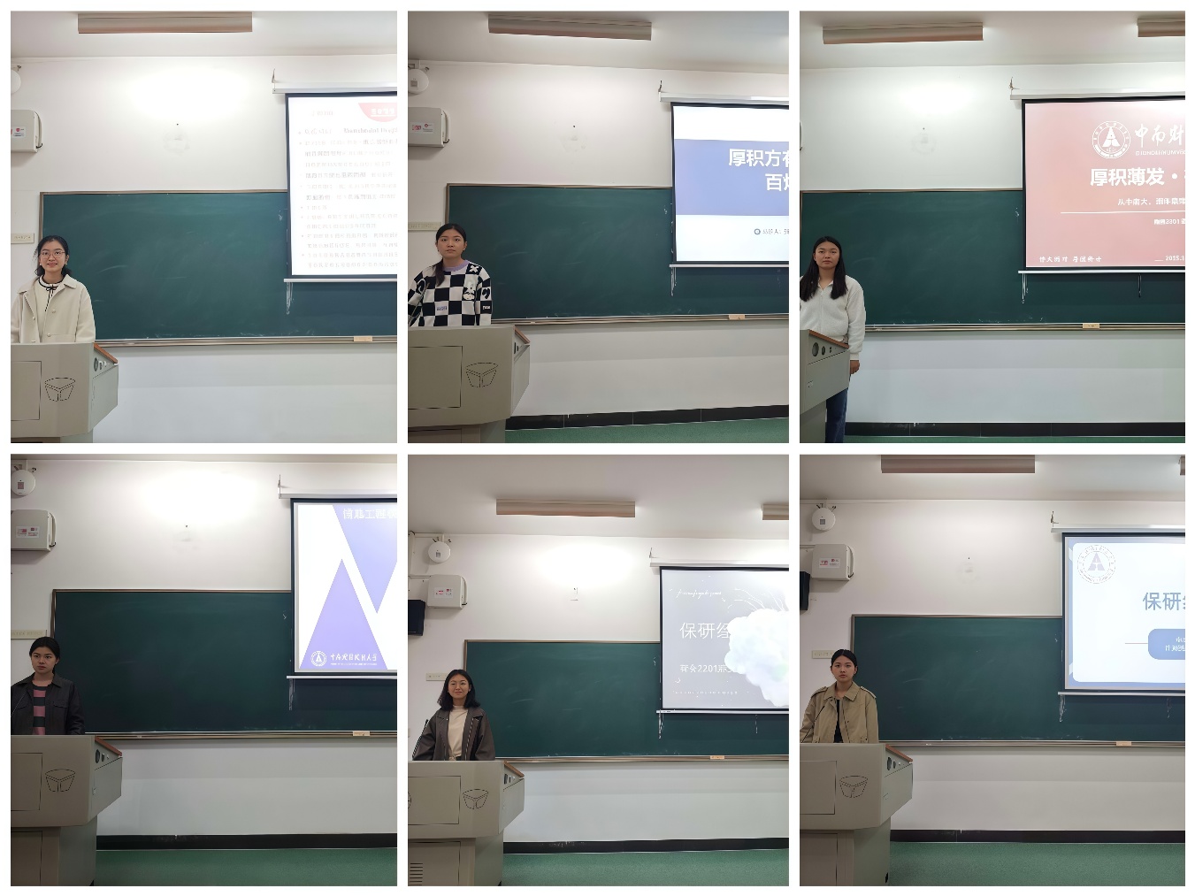 保研至浙江大学计算机学院直博的冯阳光师姐,围绕学业成绩、科研竞赛与未来规划分享,突出科研经历价值与加权成绩的重要性;保研至武汉大学人工智能学院的吴可莹师姐,从学习、英语、科研、竞赛四方面讲解,强调平衡学业与课余活动,以及英语持续学习和科研竞赛“在精不在多”;保研至华南理工大学的蒋支钱师姐,以“种子成长”为喻分享保研经历与实习经验,传递“借力”策略与积极心态;保研至中国科学院大学的瞿博文师姐,用清晰框架解析保研核心,结合自身经历鼓励同学多尝试、不惧挫折;保研至中央财经大学会计学院的陈文静师姐,聚焦成绩、竞赛、科研,强调信息获取及时性与院校匹配度;保研至中南财经政法大学的戴佳妮师姐,梳理推免全流程,叮嘱重视成绩与调整心态。