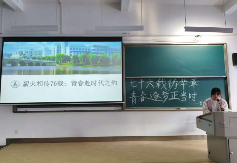 活动在庄严的团歌声中拉开帷幕。主持人罗钰洁首先介绍了本次活动的主题与背景,强调了七十六年来国家发展的辉煌成就与青年使命的紧密联系。随后,全体同学共同观看了反映中国共产党领导全国各族人民奋斗历程的相关视频,重温那段波澜壮阔的峥嵘岁月。