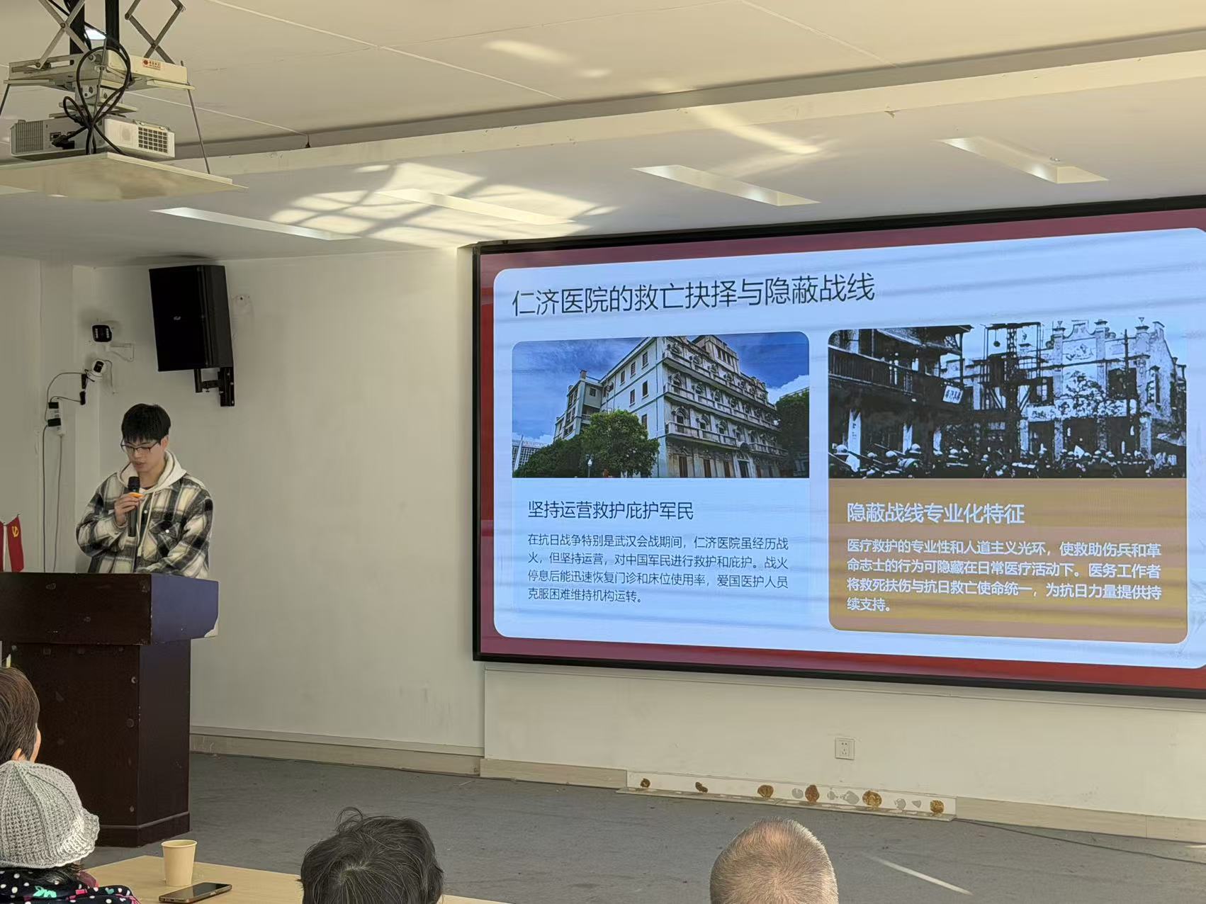 吴子敬从历史背景、抗战中的作用以及其对当今启示,深入介绍了武汉仁济医院。社区同志得以窥见仁济医院旧址下埋葬的中国医院发展血泪史。仁济医院由英国传教士杨格非创建,既是当时“西医东渐”社会风潮的具象体现,更因其传教士创办的特殊背景、西医诊疗的中立属性,以及外籍关联的身份庇护,成为战乱中保护了无数战士的“灰色地带”。