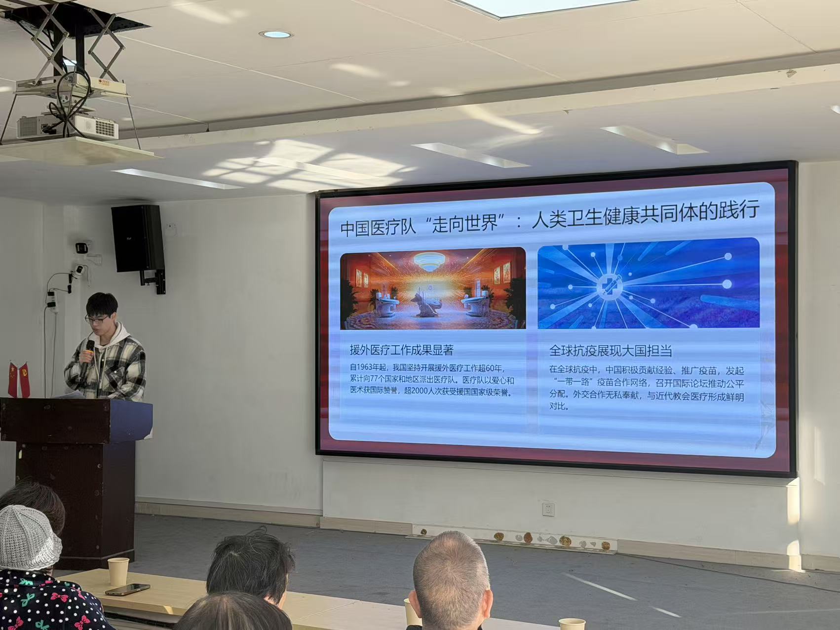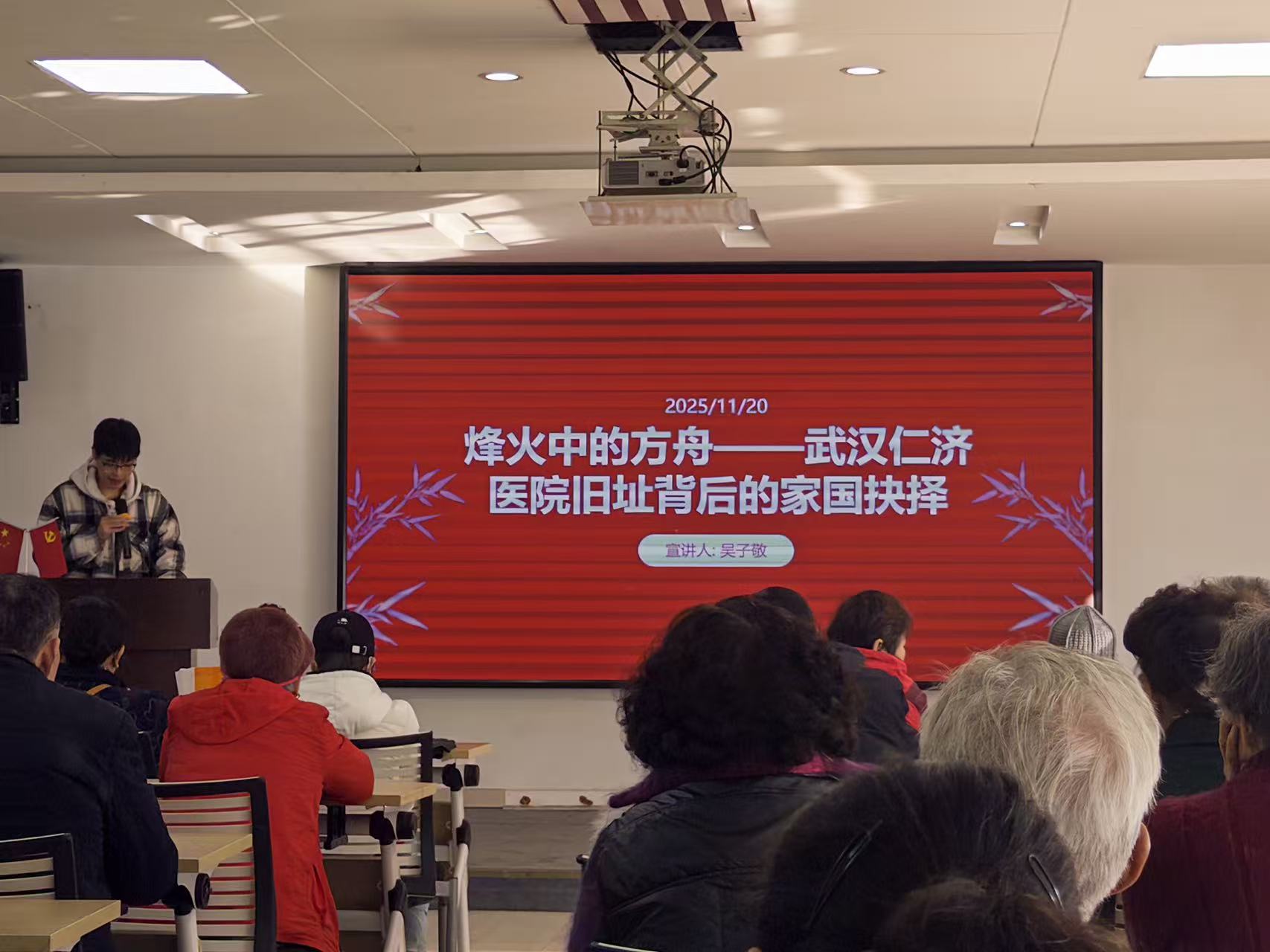 新闻网讯(学生通讯员 李思瑶)为鼓励基层党员学习武汉红色故事并增强其对党的向心力,11月20日,哲学院组织志愿者赴武昌区粮道街街道花园山社区开展“花园讲堂”第八期活动,学生党员吴子敬为社区讲授“烽火中的方舟——武汉仁济医院旧址背后的家国抉择”专题党课。