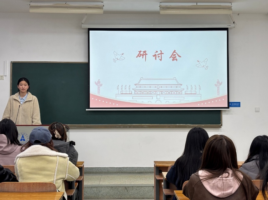 活动在庄严的团歌中开始。随后进入核心环节——“抗战精神关键词研讨会”。此前,团支委已收集了同学们“最受触动的抗战精神关键词”,并最终聚焦于“担当”“初心”“协作”三个高频词组织大家进行深度研讨。同学们分为三组,围绕各自关键词展开热烈讨论。研讨中,大家不仅回溯历史,探寻“担当”在抗战时期基层组织中的坚毅体现、“初心”在根据地公共服务中的真挚坚守、“协作”在广泛群众动员中的卓越智慧,更着力将历史精神与当下校园生活及专业特质相结合。