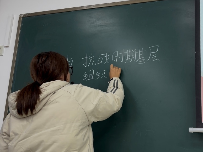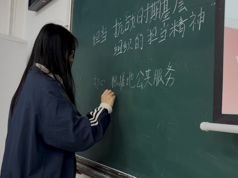 思想的火花需要被看见。在研讨过程中,三位同学代表走上前台,将小组讨论的结晶郑重书写于黑板之上:“担当——抗战时期基层组织的‘担当精神’”“初心——根据地公共服务的‘为民初心’”“协作——群众动员中的‘协同智慧’”。这些关键词及其阐释,不仅是对历史的致敬,更是连接过去与现在的桥梁。同学们进一步探讨了这些精神如何注入日常:以“担当”面对学业与班级责任,以“初心”指引公共服务价值取向,以“协作”提升团队项目效能。大家亦深刻感受到,公管院训“上进、知止、守正、创新”,与抗战精神血脉相通。“上进”源于不屈不挠的奋斗意志,“知止”契合纪律如铁的坚守,“守正”是对正义与真理的捍卫,而“创新”则是在新时代传承精神、开拓事业的重要路径。