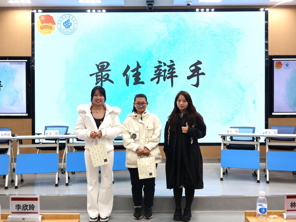 比赛期间,评委团从辩题定义、逻辑架构、价值升华等维度进行专业点评,既肯定辩手们的精彩表现,也提出针对性建议。活动采用“评委投票+学员投票”的加权投票制,最终评选出“创赢时代队”和“我说的都队”两支优胜队伍,由团学骨干杨奕睿和吴瑷安进行颁奖。汪绮梦、陈诺馨两位同学获评“最佳辩手”,由辩论队队长郭亚晴颁奖。
