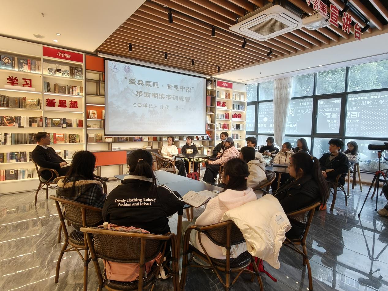 新闻网讯(学生通讯员 常永欣)12月18日下午,“经典领航·哲思中南”第四期读书训练营第八、九讲活动在南湖校区倍阅书店如期举行。湖北省新华书店倍阅高校校园文化服务平台运营总监王颖超老师作为主讲嘉宾,继续为营员们讲解吴承恩的著作《西游记》。本次课程王老师主要讲授师徒四人寻找真经的真实目的。
